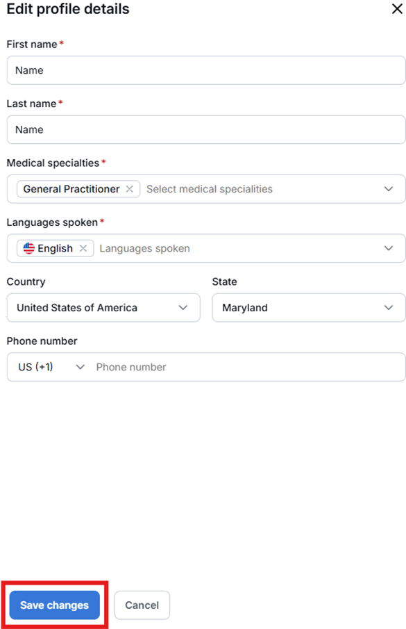 - Both Medical Specialties and Languages Spoken fields act as drop-down menu’s which allow for multiple selections.