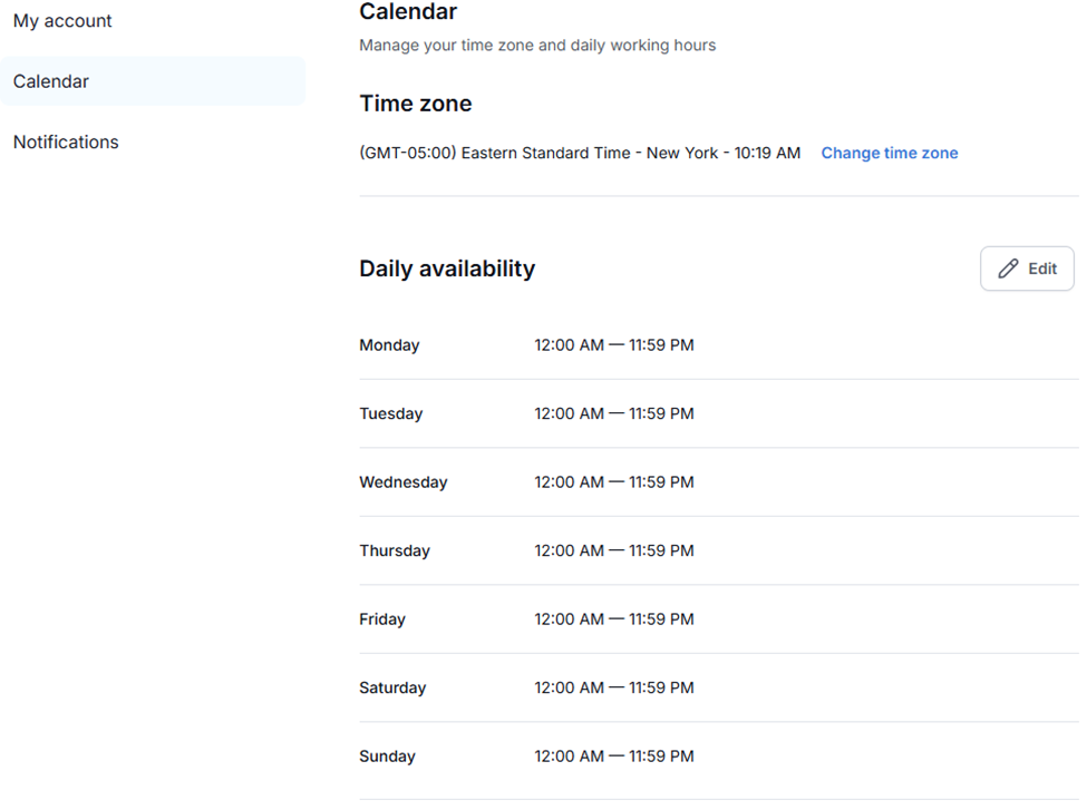 Keeping your time zone and availability settings accurate ensures smooth coordination with patients and prevents scheduling conflicts.
