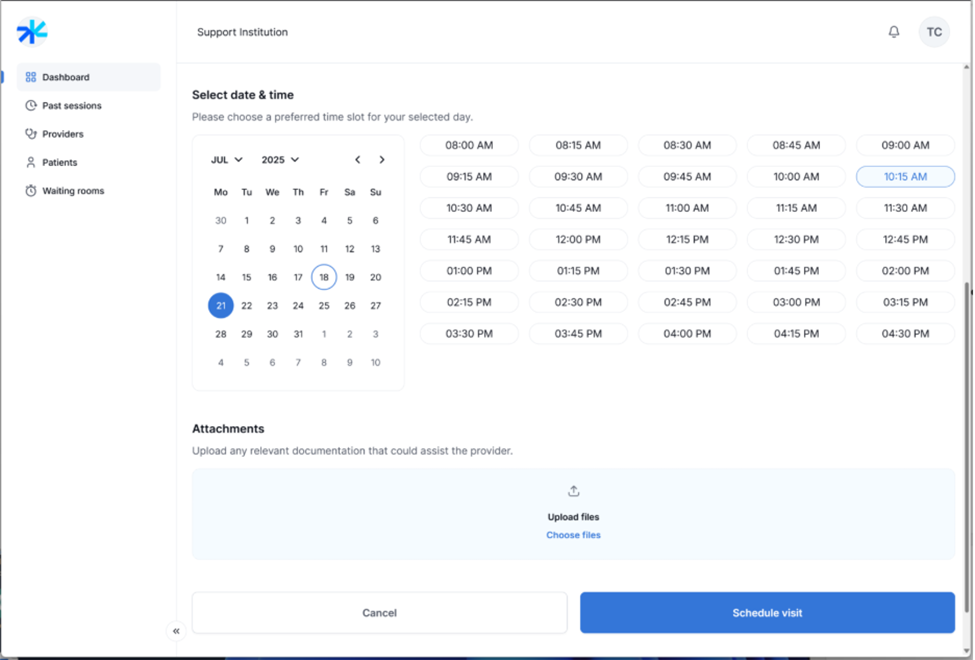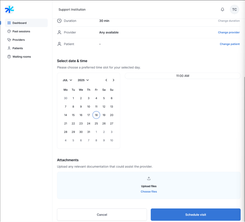 If needed, you can upload and attach any relevant documentation for the session.