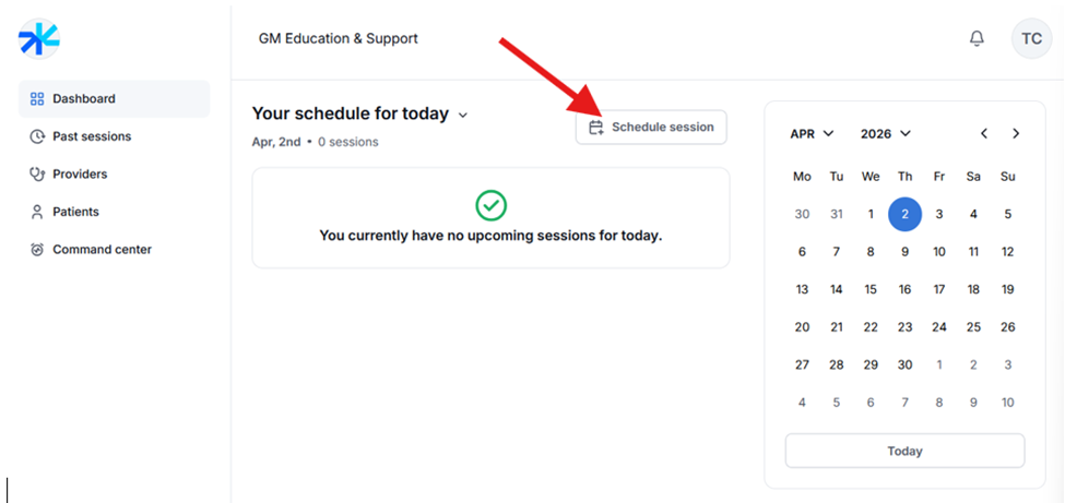 From your dashboard, click on the “Schedule Session” button located at the top right corner.