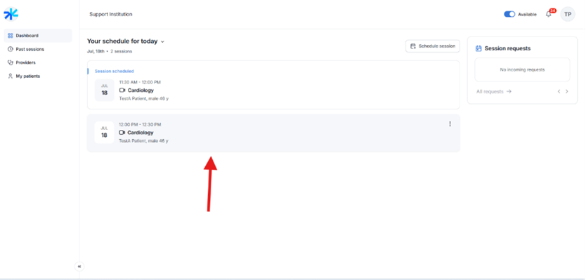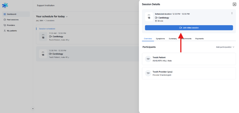 - Review session details, including the appointment time, Patient info, and any shared notes.
