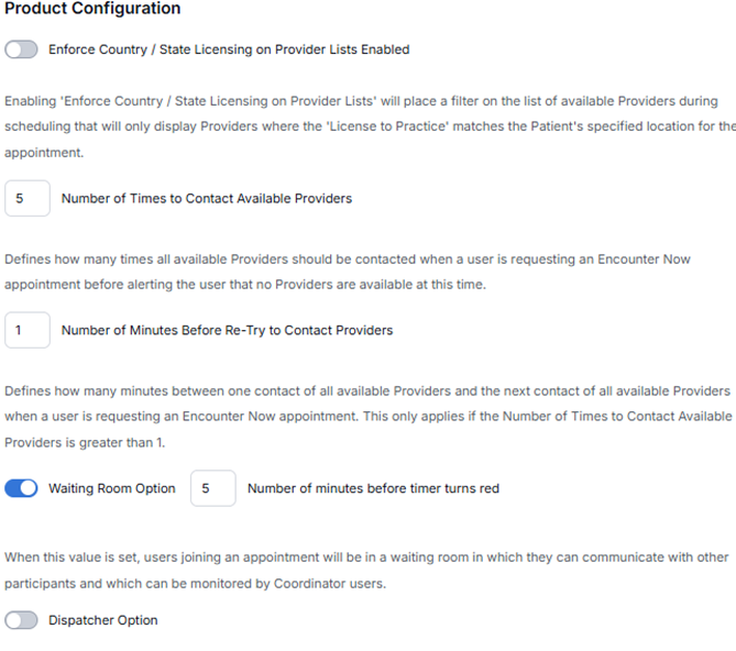 Decide if users should be placed in a virtual waiting room before being connected with a provider. - Enable/Disable Dispatcher Option
