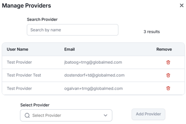 Select from the list of providers and click the “Add Provider” button. Delete a provider from a service by clicking the “” button.