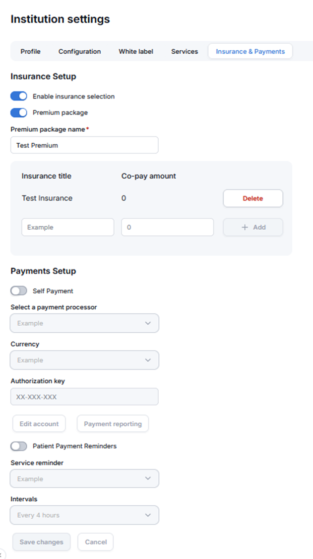 - Self-Payment Options – Set up self-pay methods for users without insurance.