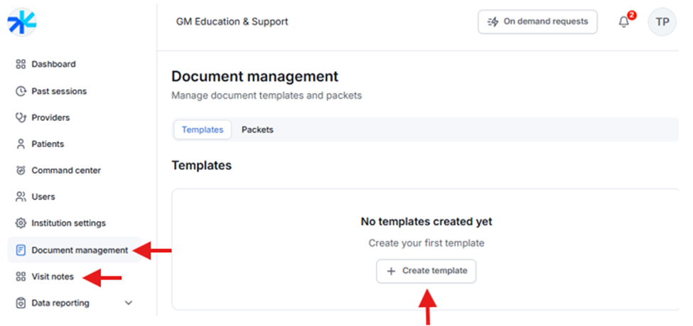 - Navigate to the Document Management or the Visit Notes section and click the + Create Template button.