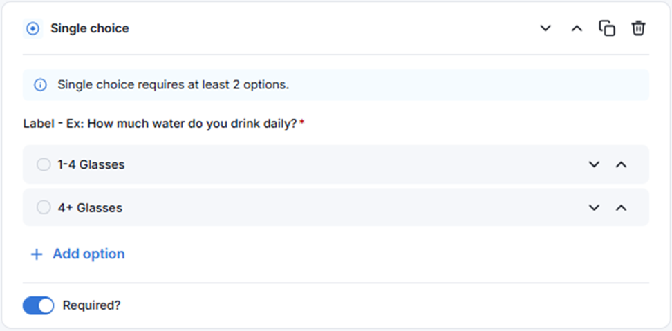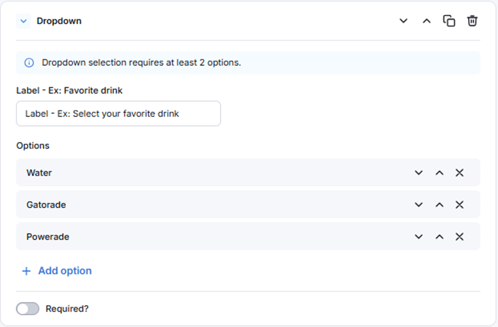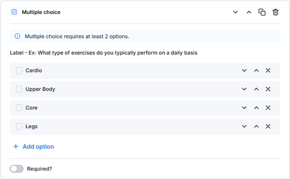 IMPORTANT: Multiple choice and selection fields allow you to add additional selections/choices be clicking the “+ Add Option” button.