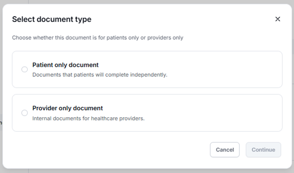 - Select whether the document will be completed by the patient or the provider and click the Continue button