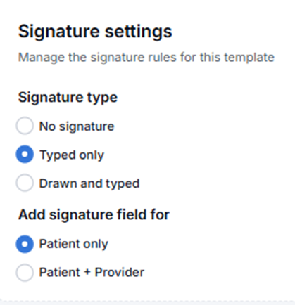- At the end of the document will be a field where you can require signatures from both patients or providers alike. Select the type of signature required and the user(s) that should be required to sign.