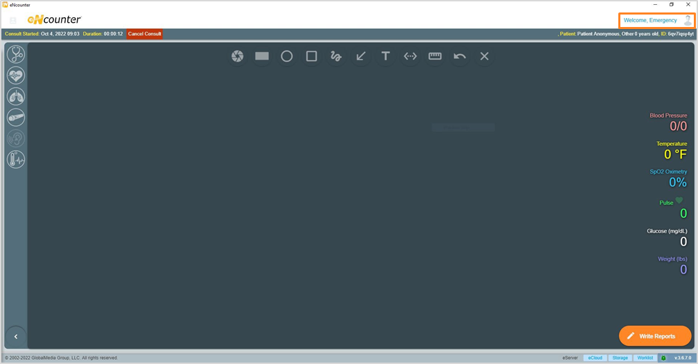 - After eNcounter is launched the Consult Screen will be displayed immediately, no login is required. The consult username will be displayed as “eNcounter User”, and the patient profile will be anonymous.